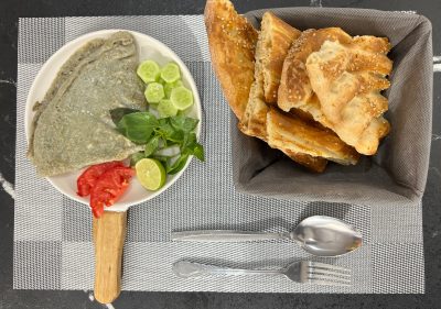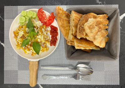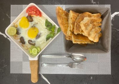 ۳عدد تخم مرغ،نعنا،کره،نان بربری، دورچین: خیار،گوجه،لیموترش