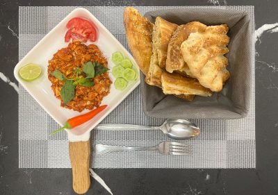 2عدد تخم مرغ،سیب زمینی،سس قرمز،کره،نان بربری،دورچین:خیار،گوجه، لیموترش