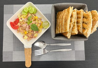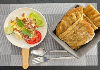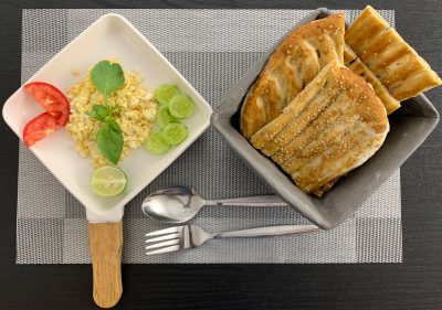 ۲عددتخم مرغ،خامه،کره،نان بربری، دورچین: خیار،گوجه،لیموترش