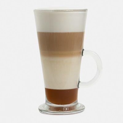 یک شات اسپرسو ۳۰٪عربیکا ۷۰٪ روبوستا ،شیر،فوم شیر،سس و سیروپ کارامل ، شکلات یا کوکی